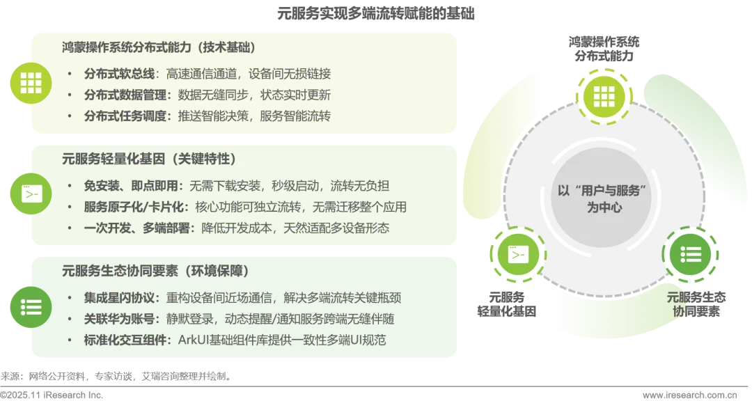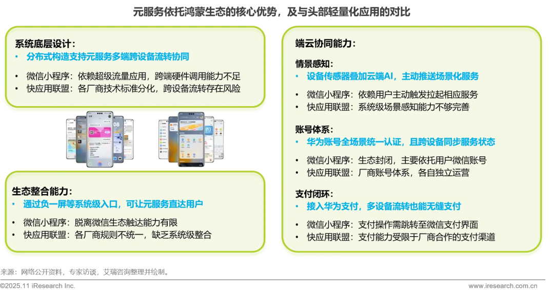 鸿蒙凭借其分布式系统架构、端云协同全链路能力及系统级生态整合三大核心特性,为元服务构筑了微信小程序和快应用等传统轻量化方案难以复制的生态护城河。基于分布式软总线与端云协同等技术底座,元服务不仅实现了全场景服务的无缝流转,更具备系统级智能主动触达的能力,从而在轻量化应用的全场景竞争中展现出显著的差异化优势与发展前景。