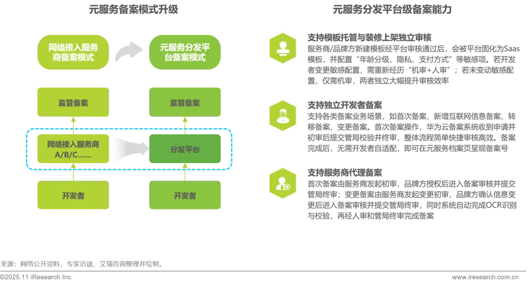 针对传统应用备案流程复杂的痛点,元服务通过备案模式升级,将传统需对接多家网络接入服务商的分散备案模式升级为分发平台统一受理的集约化解决方案。分发平台级备案能力,一方面支持模板托管与装修上架独立审核,服务商模板通过后可固化为SaaS模板并适配敏感项审核逻辑;另一方面覆盖独立开发者场景(首次、新增、转移备案等)与服务商代理备案场景,将复杂环节交由平台处理,实现备案流程的简化与自动化,大幅提升备案效率,优化开发者上架旅程体验。