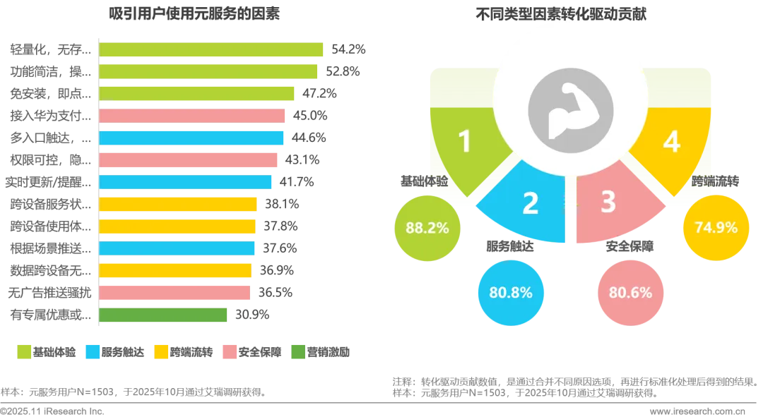 元服务的用户转化主要由其轻量化与便捷性的核心特质驱动,其中“轻量化、无存储压力”、“功能简洁、操作直观”和“免安装、即点即用”是吸引用户使用的三大关键因素。从吸引力贡献来看,除基础体验外,服务触达效率、安全保障能力以及跨端流转体验同样具有显著影响力,表明用户转化是由多维度优势共同作用的结果。