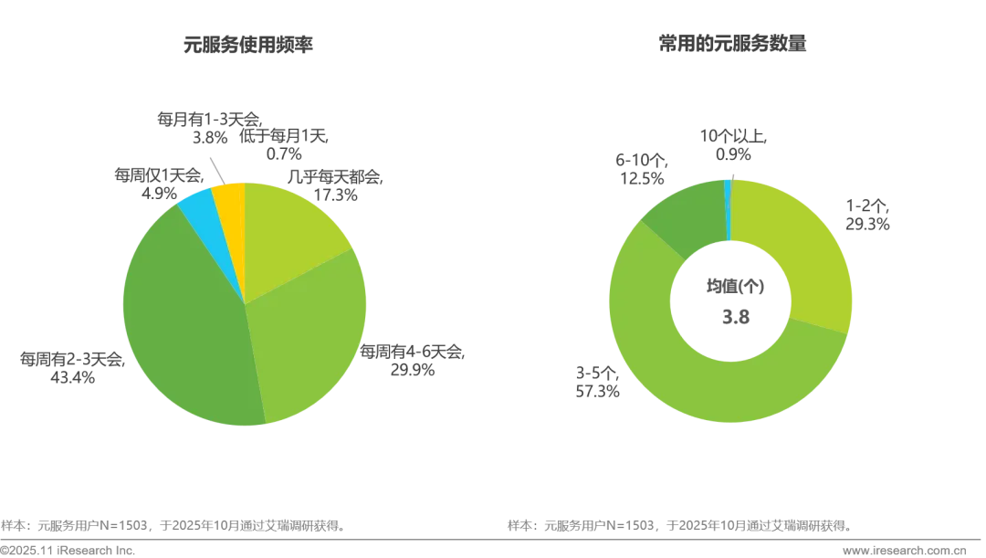 元服务日常使用呈现高频率、多服务同时使用的特征。近五成用户每周至少有四天会使用元服务,其中“几乎每天都会”使用的占比达17.3%,反映出元服务已深度融入用户日常生活;在使用数量上,用户常用元服务的平均数量为3.8个,70%以上的用户日常至少同时使用三个元服务,表明元服务在满足多样化、碎片化需求方面具备较强粘性与需求承载能力。