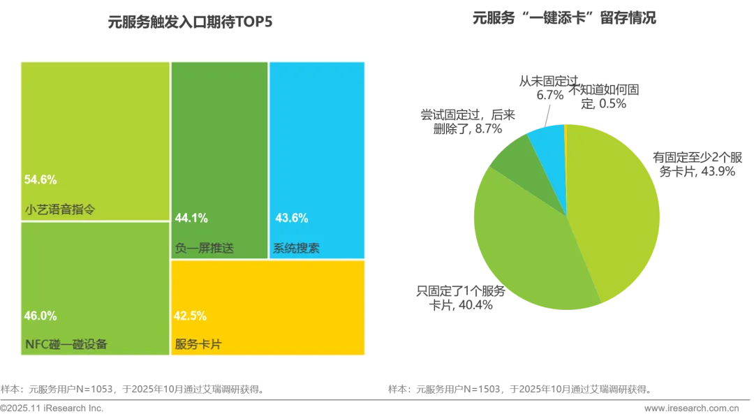 在元服务触发交互方式期待上,小艺语音凭借智能性与便捷性成为首选方式,而NFC近场交互(碰一碰),负一屏推送、系统搜索及服务卡片也广受用户欢迎。同时,元服务一键添卡展现出优异的用户粘性,桌面卡片留存率合计超八成。这凸显了语音交互、场景化触发与服务卡片形态的核心价值,建议开发者优先围绕这些方向优化交互体验、拓展场景应用,通过强化场景化设计进一步抢占用户心智。