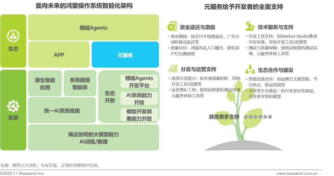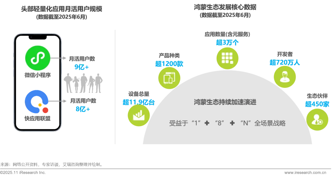 当前头部轻量化应用中,微信小程序凭借社交场景的深度渗透,月活用户超9亿;快应用联盟则通过多厂商协同的生态布局,月活用户超8亿,两者均已形成规模化发展态势;此外,鸿蒙生态也已呈现出强劲发展势头,截至2025年6月,其应用数量(含元服务)已突破3万个,覆盖产品种类超1200款,设备总量超11.9亿台,并凝聚了超720万开发者和超450家生态伙伴。未来鸿蒙生态将继续在 “1+8+N”全场景战略深化的加持下加速前进,而基于鸿蒙生态的元服务也必将具备广阔的发展空间。