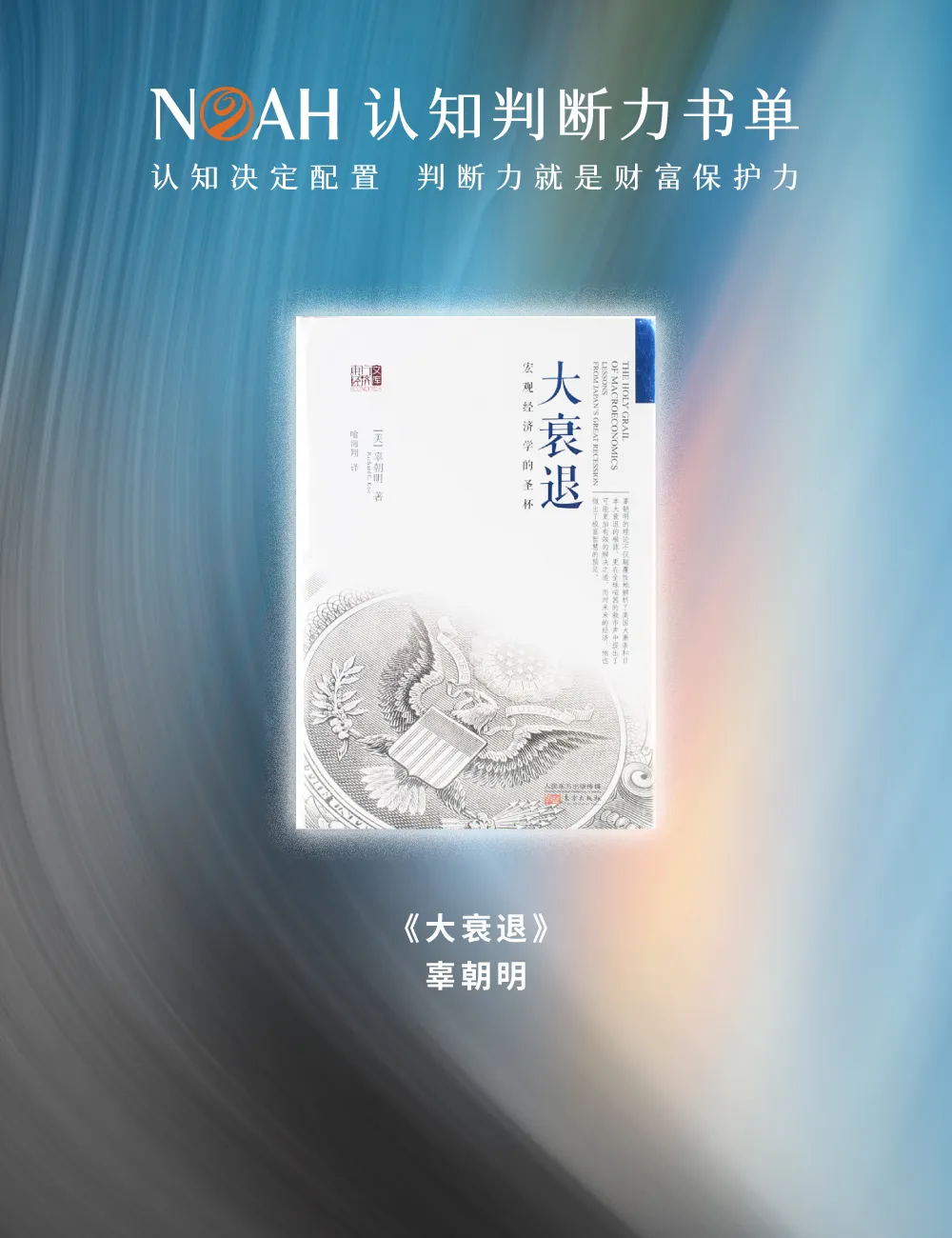 本期「NOAH认知判断力书单」聚焦辜朝明《大衰退》中提出的「资产负债表衰退」理论。这一框架并不提供短期答案,从债务收缩的本质出发,揭示经济在泡沫破灭后的真实逻辑。该书从结构性视角诠释了通缩困境、政策局限与资产行为的长期分化,帮助我们穿透波动,更本质地思考财富的长期安全。这与诺亚所秉持的「认知决定配置,判断力就是财富保护力」理念深度契合。我们坚信,建立在结构性认知之上才能构建具备穿越周期韧性的资产框架。