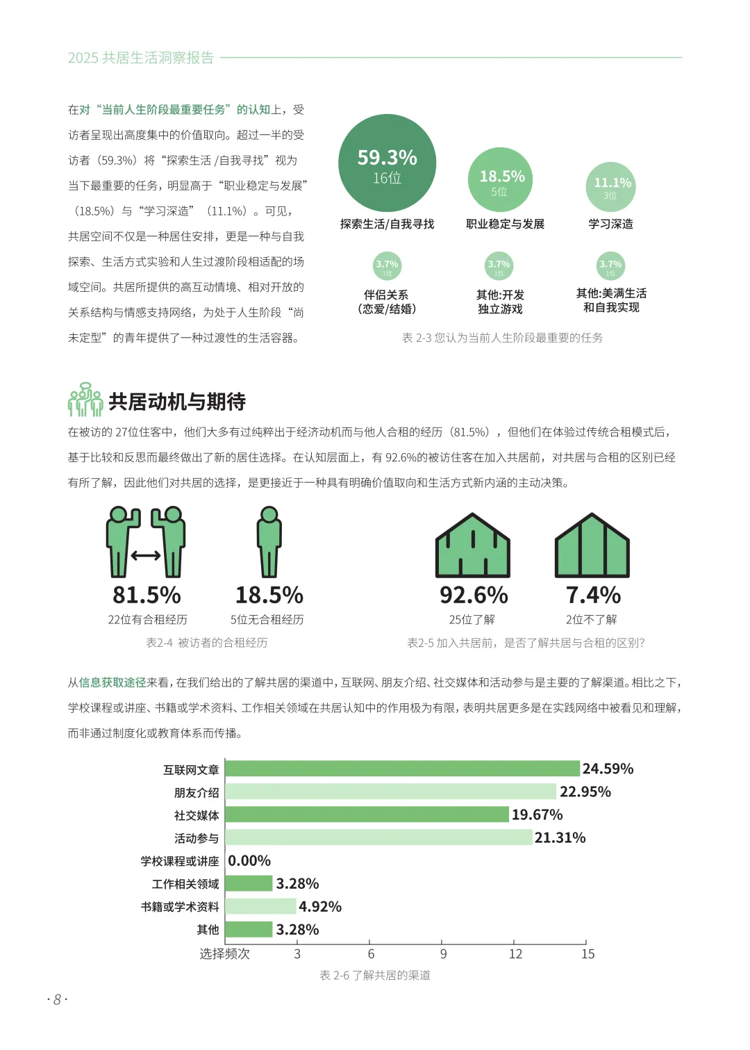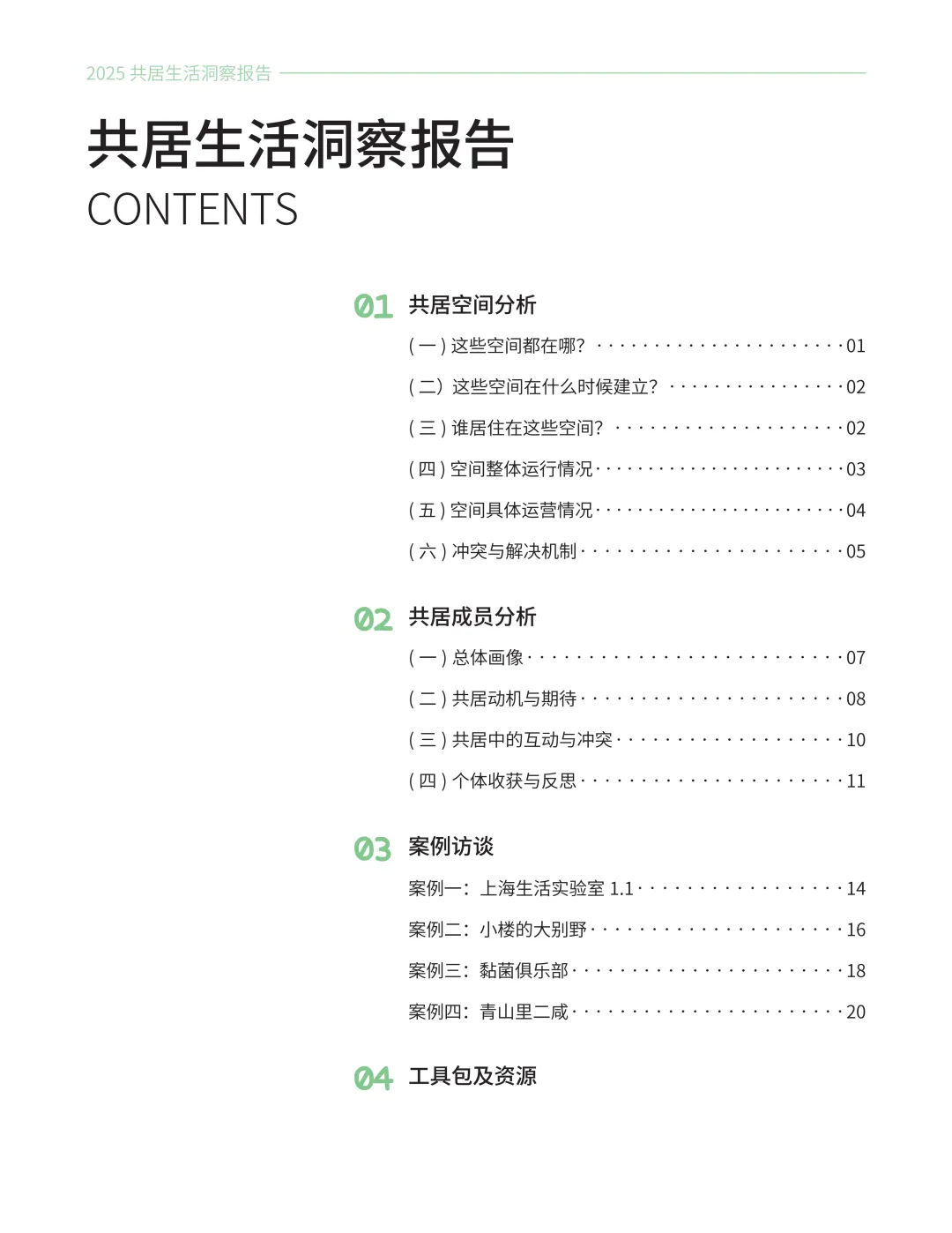 报告分为四个小节,第一二节以问卷调查结果为主,分别分析当下共居空间与空间实践者的发展情况,第三节以访谈为主体,提供四个不同模式下案例的具体经验,最后一节分享了部分共居工具包与联系人名录。