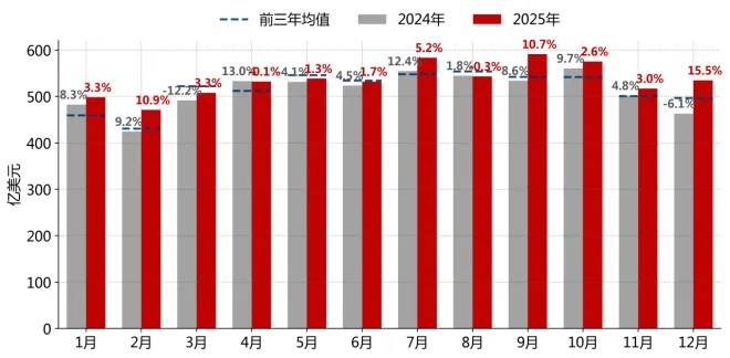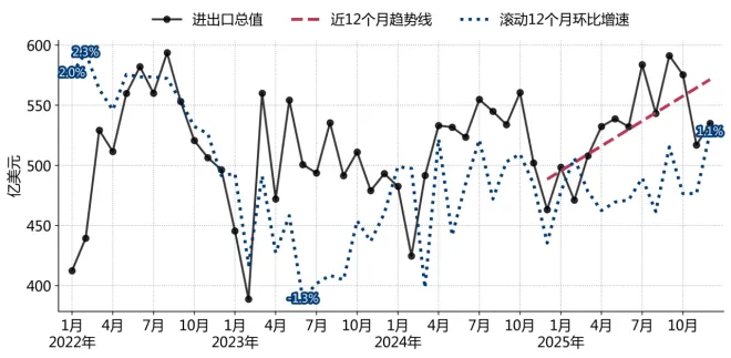2025年1-12月,巴西进出口累计6425.6亿美元,同比(较上年)增长4.6%,其中12月当月进出口534.9亿美元,同比增长15.5%,环比(较上月)增长3.5%,近12个月趋势向上。