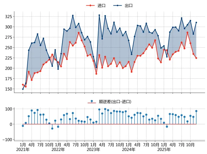 图 1_42021-2025年12月巴西进口、出口及顺逆差走势图(亿美元) 数据来源:发展、工业、商业和服务部, 瀚闻资讯