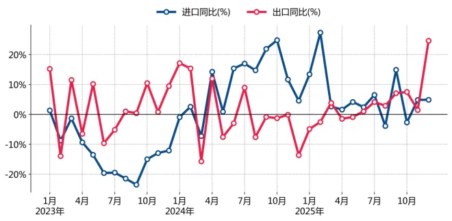图 1_52023-2025年12月巴西进口、出口当月同比增速走势图(%) 数据来源:发展、工业、商业和服务部, 瀚闻资讯