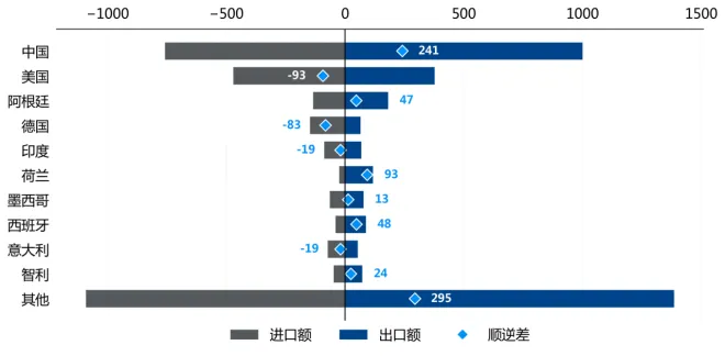 按顺逆差统计(出口额减进口额),2025年1-12月,巴西贸易顺差为547.9亿美元,具体来看,巴西对美国贸易出现93.3亿美元逆差,对中国实现241.5亿美元顺差。