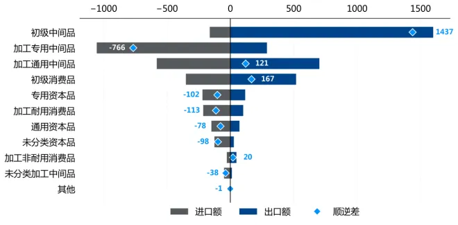 从价值链看,加工专用中间品贸易出现766.2亿美元逆差,初级中间品实现1437.4亿美元顺差。