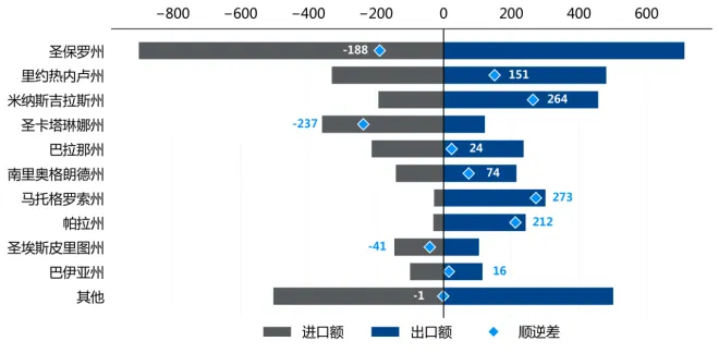 从省州数据来看,圣卡塔琳娜州贸易出现236.9亿美元逆差,马托格罗索州实现272.9亿美元顺差。