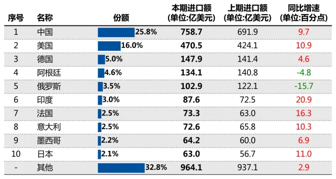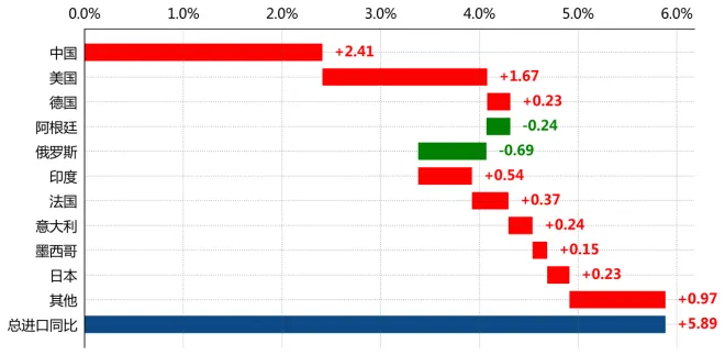 按拉动度分解,巴西自中国进口拉动整体增速2.4个百分点,自美国进口拉动整体增速1.7个百分点,自俄罗斯进口拖累整体增速0.7个百分点。(注:此处拉动度为本年自该贸易伙伴进口金额的变动与上年同期进口总值的比值。)从份额来看,中国、美国、德国占巴西总进口的比重分别为25.8%、16.0%、5.0%。