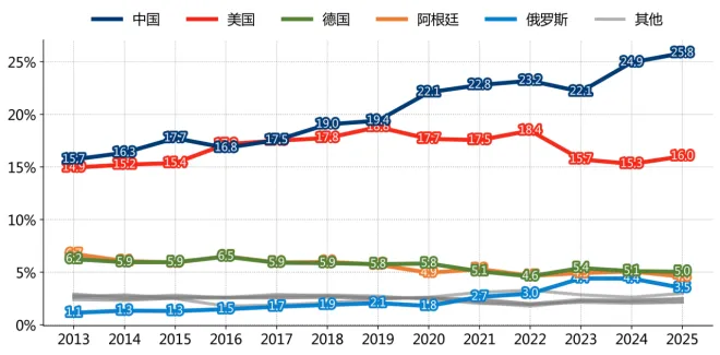 图 1_112013-2025年12月主要贸易伙伴占巴西进口份额变化情况 数据来源:发展、工业、商业和服务部, 瀚闻资讯