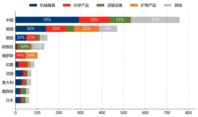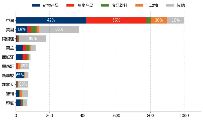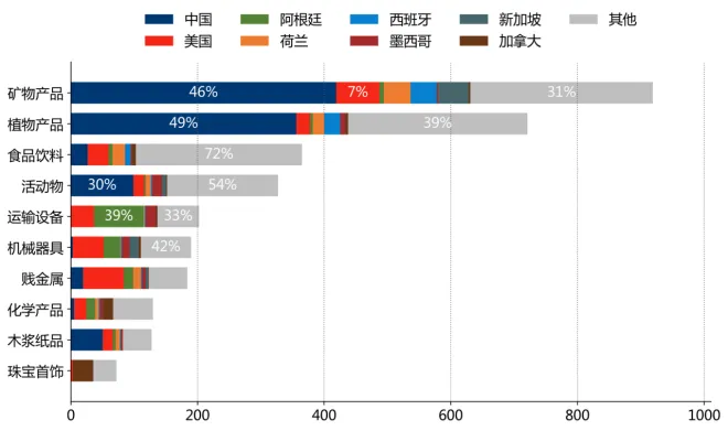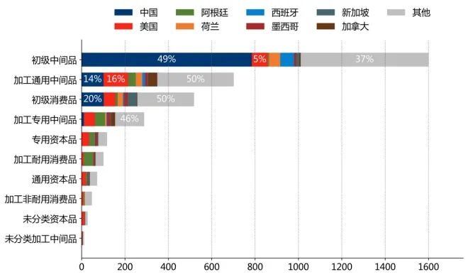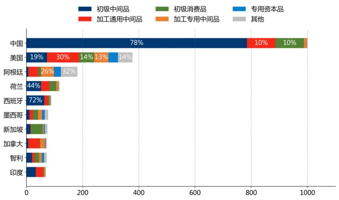 从价值链看,"初级中间品"占对中国、西班牙、印度出口总值的比重为78.5%、72.1%、48.4%;"加工通用中间品"占对加拿大、印度、美国出口总值的比重为55.5%、37.9%、30.2%;"初级消费品"占对新加坡、墨西哥、智利出口总值的比重为55.1%、22.9%、22.6%。