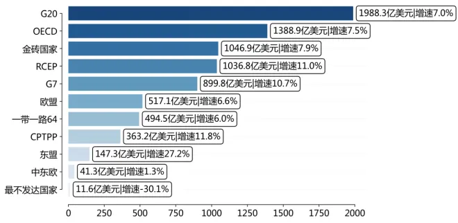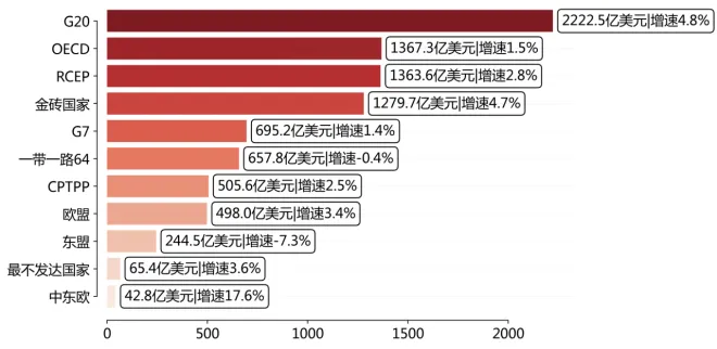分主要经济组织/合作机制看,2025年1-12月,巴西出口前三名分别是G20、OECD、RCEP等,其中,G20规模第一,金额2222.5亿美元,同比增长4.8%;中东欧增速最高,金额42.8亿美元,同比增长17.6%。