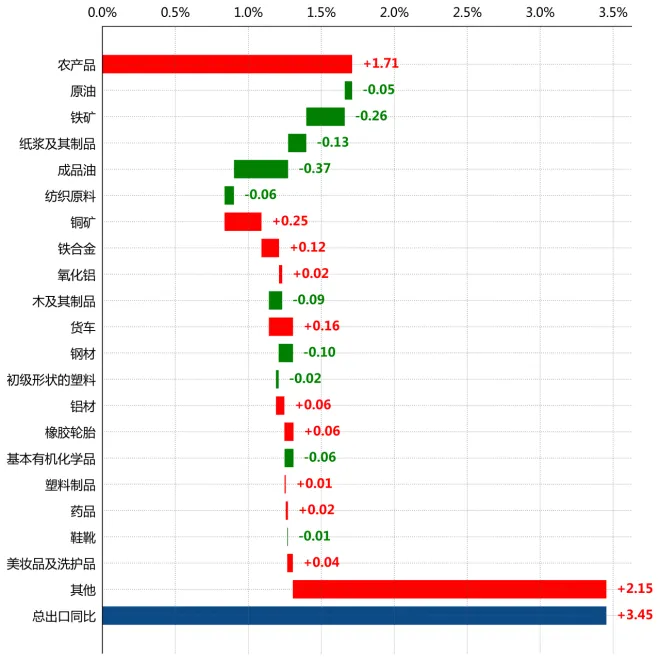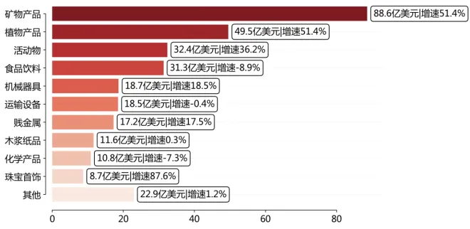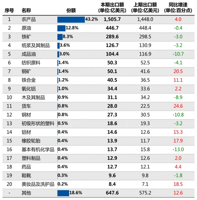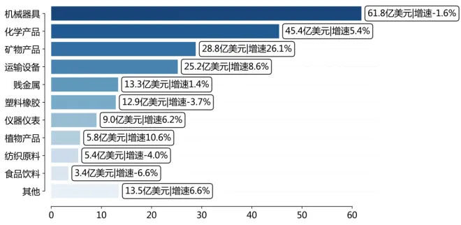 从商品大类看,"机械器具(84-85章)"贸易出现611.7亿美元逆差,"植物产品(06-14章)"实现656.0亿美元顺差。