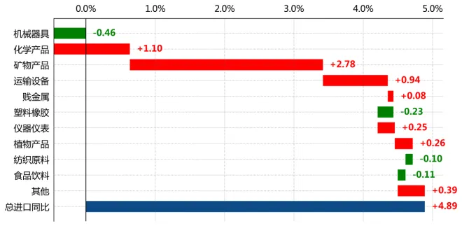 按拉动度分解,"矿物产品(25-27章)"进口拉动整体增速2.8个百分点,"化学产品(28-38章)"进口拉动整体增速1.1个百分点,"运输设备(86-89章)"进口拉动整体增速0.9个百分点。(注:此处拉动度为本年该商品大类进口金额的变动与上年同期进口总值的比值。)从份额来看,"机械器具(84-85章)"、"化学产品(28-38章)"、"运输设备(86-89章)"占巴西总进口的比重分别为27.3%、21.8%、11.8%。