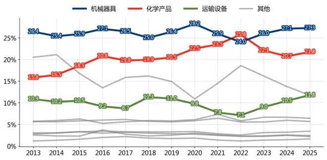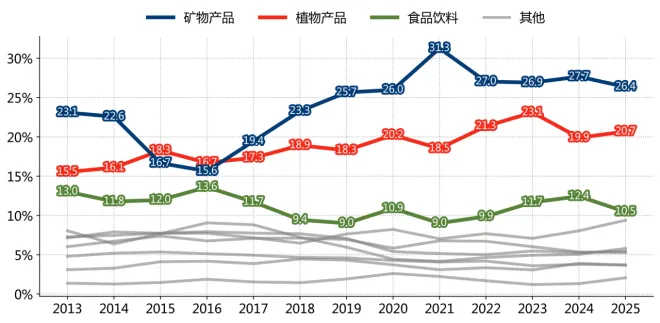 图 1_352013-2025年12月主要品类占巴西出口份额变化情况(按BEC5统计) 数据来源:发展、工业、商业和服务部, 瀚闻资讯