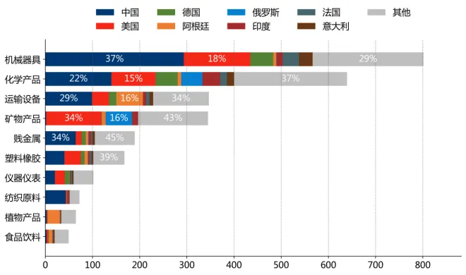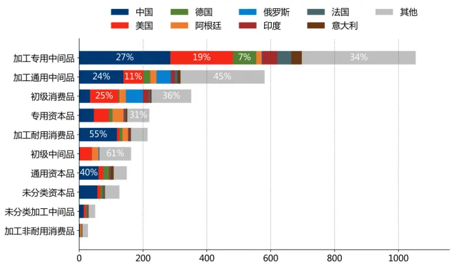 从价值链看,"加工专用中间品"占自法国、日本、印度进口总值的比重为59.9%、55.8%、54.3%;"加工通用中间品"占自俄罗斯、中国、德国进口总值的比重为43.8%、18.2%、15.3%;"初级消费品"占自俄罗斯、印度、美国进口总值的比重为52.1%、20.6%、18.9%。
