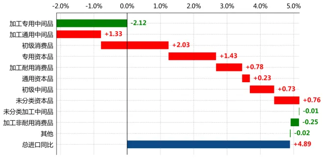 按拉动度分解,"加工专用中间品"进口拖累整体增速2.1个百分点,"初级消费品"进口拉动整体增速2.0个百分点,"专用资本品"进口拉动整体增速1.4个百分点。(注:此处拉动度为本年该品类进口金额的变动与上年同期进口总值的比值。)从份额来看,"加工专用中间品"、"加工通用中间品"、"初级消费品"占巴西总进口的比重分别为35.9%、19.8%、12.0%。