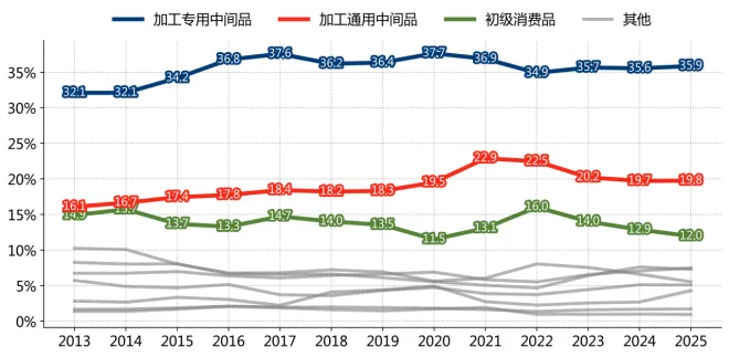 图 1_212013-2025年12月主要品类占巴西进口份额变化情况(按BEC5统计) 数据来源:发展、工业、商业和服务部, 瀚闻资讯
