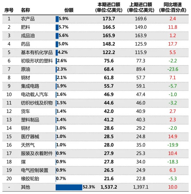 分具体商品看,2025年1-12月,巴西进口主要是农产品、肥料、成品油等,其中,"农产品"进口规模第一,金额173.7亿美元,同比增长2.4%;"药品"进口增速最高,金额148.2亿美元,同比增长17.7%;总体来看,在主要品类中,有11个同比增速保持增长。