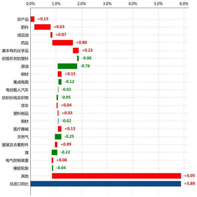 按拉动度分解,"药品"进口拉动整体增速0.8个百分点,"原油"进口拖累整体增速0.8个百分点,"肥料"进口拉动整体增速0.6个百分点。(注:此处拉动度为本年该商品进口金额的变动与上年同期进口总值的比值。)从份额来看,农产品、肥料、成品油占巴西总进口的比重分别为5.9%、5.7%、5.6%。