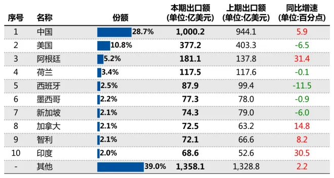 按伙伴统计,2025年1-12月,巴西对全球出口前三位贸易伙伴分别是中国、美国、阿根廷等,其中,巴西对中国出口规模第一,金额1000.2亿美元,同比增长5.9%;对阿根廷出口增速最高,金额181.1亿美元,同比增长31.4%;总体来看,在前十位伙伴中,有5个同比增速保持增长。