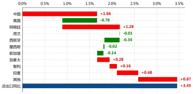 按拉动度分解,巴西对中国出口拉动整体增速1.7个百分点,对阿根廷出口拉动整体增速1.3个百分点,对美国出口拖累整体增速0.8个百分点。(注:此处拉动度为本年对该贸易伙伴出口金额的变动与上年同期出口总值的比值。)从份额来看,中国、美国、阿根廷占巴西总出口的比重分别为28.7%、10.8%、5.2%。