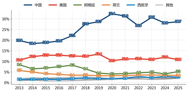 图 1_252013-2025年12月主要贸易伙伴占巴西出口份额变化情况 数据来源:发展、工业、商业和服务部, 瀚闻资讯