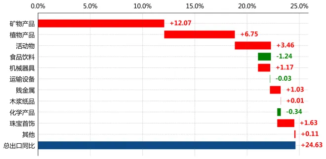 按拉动度分解,"矿物产品(25-27章)"出口拉动整体增速12.1个百分点,"植物产品(06-14章)"出口拉动整体增速6.7个百分点,"活动物(01-05章)"出口拉动整体增速3.5个百分点。(注:此处拉动度为本年该商品大类出口金额的变动与上年同期出口总值的比值。)从份额来看,"矿物产品(25-27章)"、"植物产品(06-14章)"、"食品饮料(16-24章)"占巴西总出口的比重分别为26.4%、20.7%、10.5%。