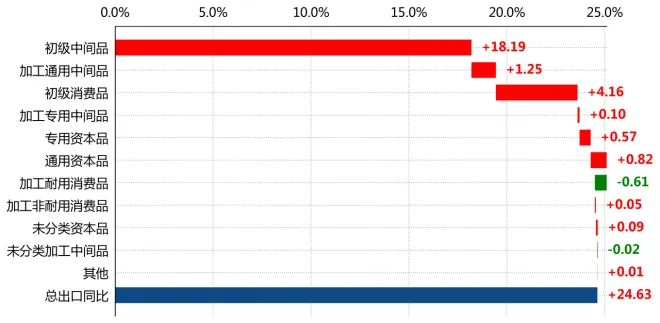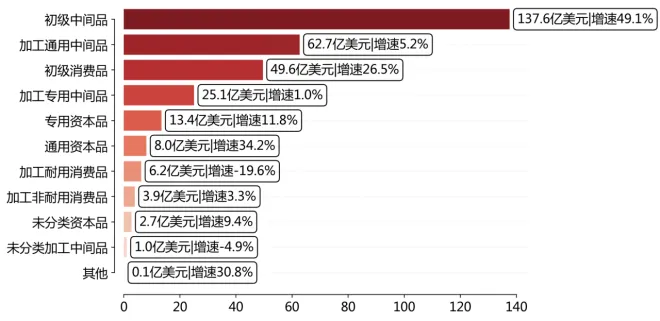 按BEC5统计,2025年1-12月,"初级中间品"出口规模和增速均第一,金额137.6亿美元,同比增长49.1%。总体来看,在主要品类中,有8个同比增速保持增长。