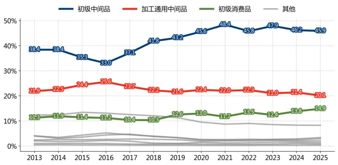 说明:联合国BEC5商品分类标准(Broad Economic Categories, Revision 5)是国际贸易统计的重要工具,用于根据商品的最终用途对其进行分类。该标准将商品分为中间品、资本品与消费品三大类。中间品包括初级产品(如原材料)、通用中间产品(如基本工业品)和专用中间产品(如特定行业用零部件),主要用于生产过程,促进上下游产业联动;资本品是用于生产的长期资产,如机器设备,能显著提升生产能力和效率;消费品分为初级产品(如未加工食品)、非耐用消费品(如日用消费品)和耐用消费品(如家用电器),直接满足消费者需求。