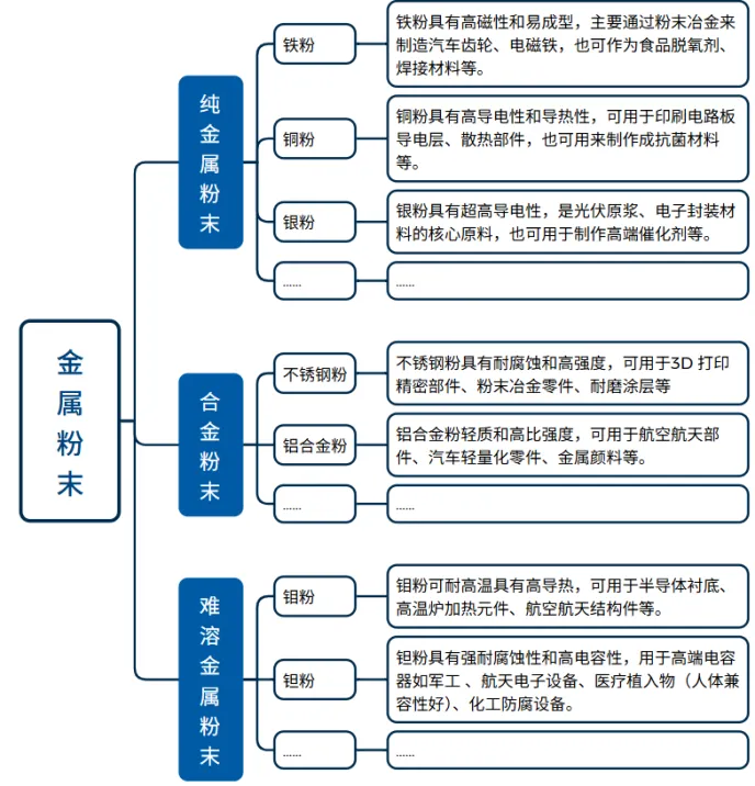 金属粉末,是指尺寸小于1mm的金属颗粒群,包括纯金属粉末、合金粉末以及具有金属性质的某些难熔金属粉末。金属粉末具有高比表面积、高活性、可塑性强等特点,能够通过粉末冶金工艺将金属粉末成型和烧结,制备成高性能金属材料或复合材料以及多种不同类型制品,这些材料通常是表面涂层、航空航天、汽车、电子、机械、建筑、3D打印、医疗等领域的核心原材料。