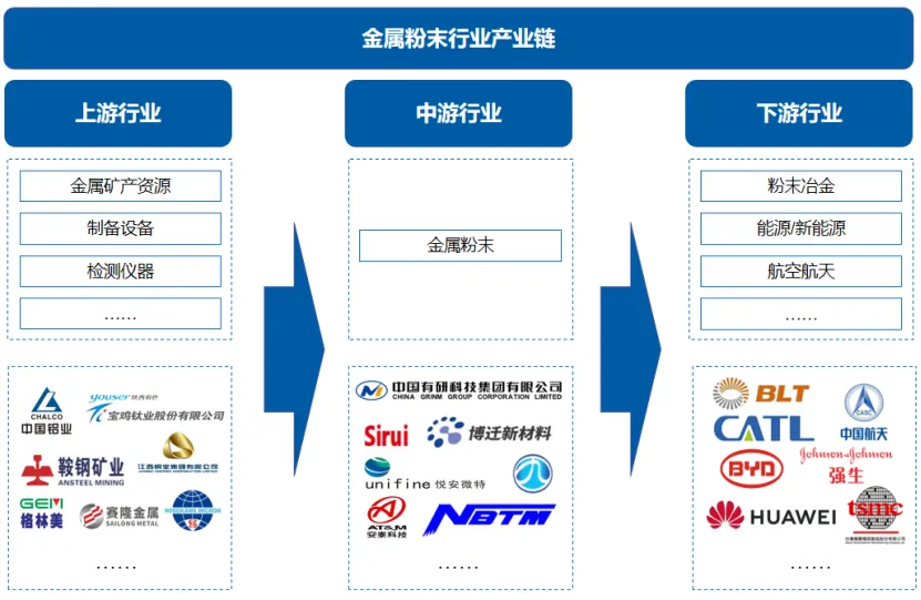 从金属粉末产业链上下游参与企业来看,上游企业包含中国铝业、江西铜业、宝钛股份等金属原材料供应商以及格林美等再生金属材料供应商以及细川密克朗集团制备设备;中游金属粉末产品生产商包含有研新材、斯瑞新材、博迁新材、悦安新材、九菱科技、东睦股份、安泰科技等金属粉末加工企业;下游应用市场涉及较广,有铂力特(3D打印)、中国航天科技集团(航空航天领域)、宁德时代、比亚迪(新能源领域)、强生(医疗领域)、华为、台积电(电子领域)等众多企业。