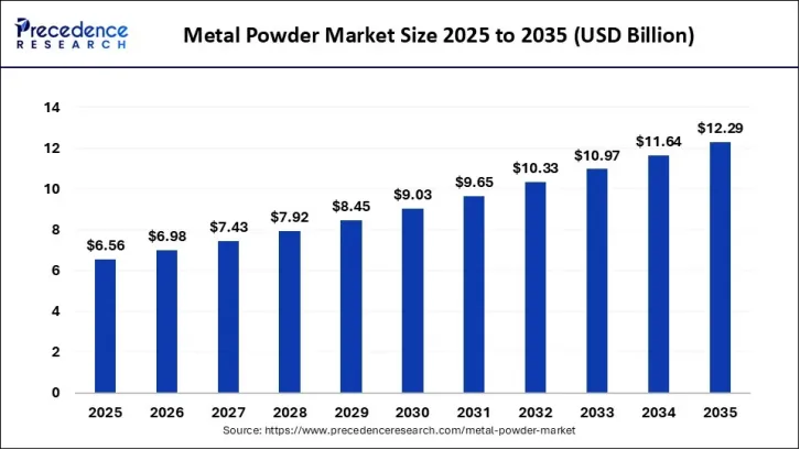 1.市场规模:金属粉末行业是材料工业的重要组成部分,对于推动制造业升级和产业结构调整具有关键作用。据Precedence Research数据显示,2025年全球金属粉末市场规模为65.6亿美元。预计该市场规模将从2026年的69.8亿美元增长至2035年的约122.9亿美元,2026年至2035年的复合年增长率为6.48%。2025年,亚太地区以35%的最高市场份额引领全球市场。