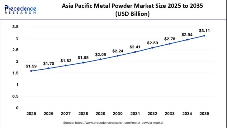 亚太地区金属粉末市场规模在2025年估计为15.9亿美元,预计到2035年将达到约31.1亿美元,2026年至2035年的复合年增长率为6.94%。中国和印度是亚太金属粉末市场的主要贡献者,得益于两国大规模的制造业、快速的工业化进程以及增材制造技术的日益普及。中国在汽车、航空航天和电子产品生产方面表现强劲,处于领先地位;而印度在汽车和工业应用中对轻量化、高性能零部件的需求正在不断增长。