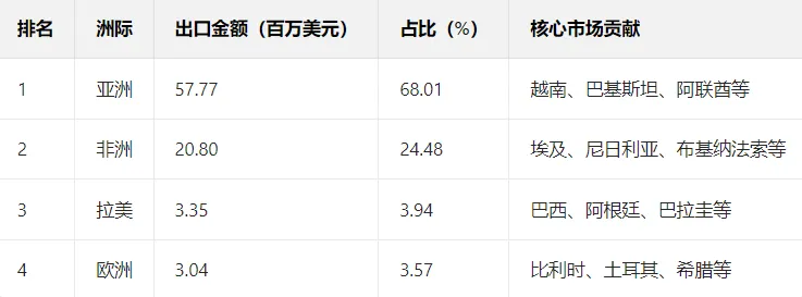 亚洲为第一大出口目的地,占比超六成;非洲为第二大市场,两者合计占比超 92%,欧洲、拉美市场规模较小。具体数据如下: