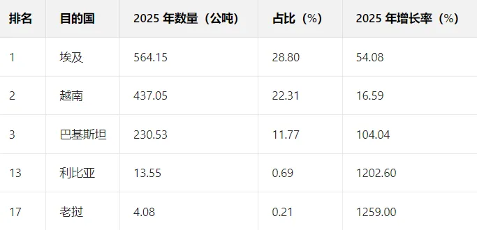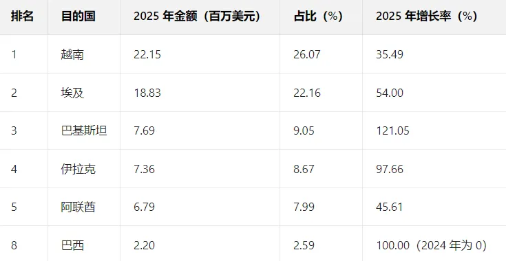 2025 年出口目的国呈现 “头部集中、长尾高增” 特征:前 5 大目的国(越南、埃及、巴基斯坦、伊拉克、阿联酋)合计贡献 64.54% 的金额,同时部分小众市场(如利比亚、老挝)增速超 10 倍。