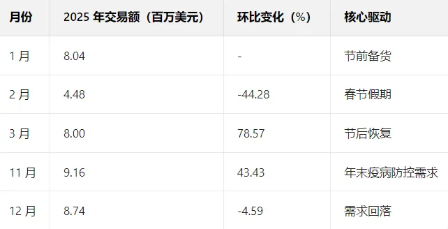 2025 年出口月度波动较大,Q2(4-6 月)为淡季,Q4(10-12 月)为旺季,11 月以 9.16 百万美元创全年峰值,2 月因春节假期降至 4.48 百万美元(全年最低):