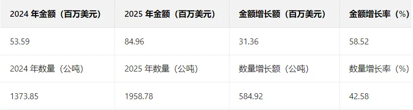巴西:9-11 月实现出口(9 月 58.02 万美元、10 月 61.91 万美元、11 月 100.38 万美元),为 2025 年新增市场。