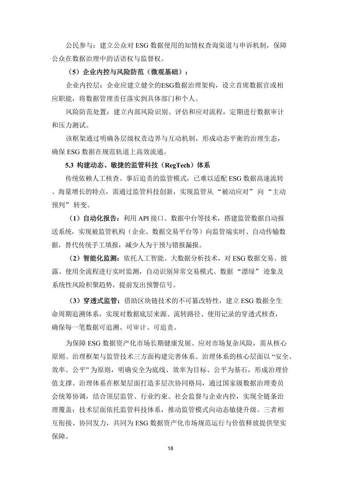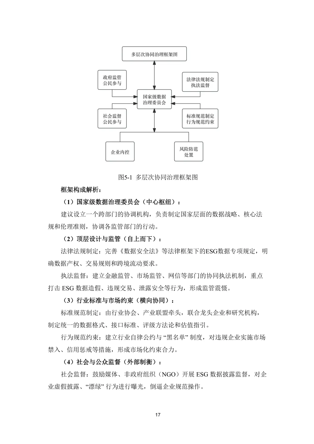 《白皮书》提出多层次治理框架:国家层面设跨部门数据治理委员会、完善法规;行业层面定统一标准、建自律机制;企业层面设首席数据官、强化内控。同时,依托监管科技实现动态监测,通过智能化监测识别“漂绿”行为并及时预警,保障市场健康运行。