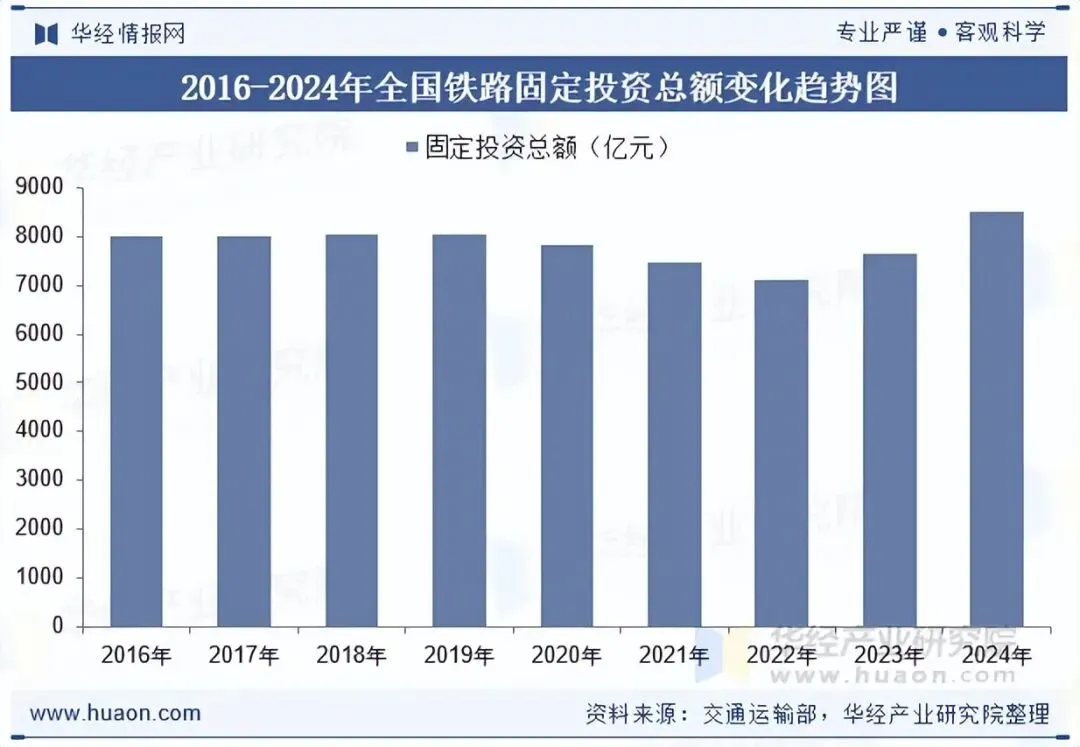 铁路交通作为我国现代交通运输体系中主要交通运输方式,具有覆盖面广、客流量大、成本相对较低、安全性高等优势,作为国家重要产业及重大民生工程,铁路交通建设一直由国家进行投资并受到国家政府部门各类政策鼓励,行业一直保持良好发展态势。据统计,2024年全国铁路固定资产投资完成8506亿元,同比增长11.3%,创历史新高。