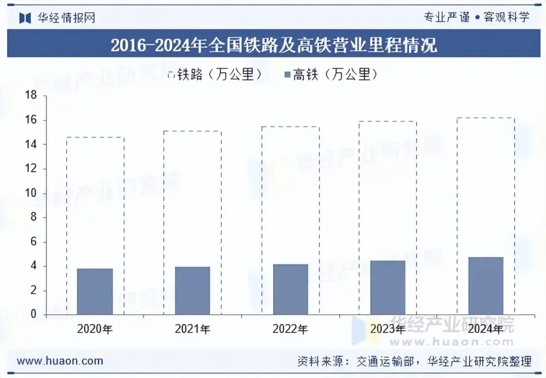 根据国务院发布的《“十四五”现代综合交通运输体系发展规划》,“十四五”期间我国铁路运营里程将从2020年的14.6万公里发展为2025年的16.5万公里;其中高速铁路营业里程将从2020年的3.8万公里发展为2025年的5万公里。根据《加快建设交通强国五年行动计划(2023-2027年)》,到2027年,全国铁路营业里程达到17万公里左右,其中高速铁路5.3万公里左右,普速铁路11.7万公里左右。截至2024年末,我国铁路营业里程达到16.2万公里,其中高铁达到4.8万公里。