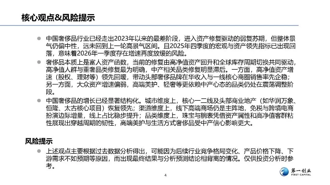 中国奢侈品行业已经走出2023年以来的最差阶段,进入资产修复驱动的弱复苏期,但整体景气仍偏中性,远未回到上一轮高景气区间。且2025年四季度的宏观与资产领先指标已出现回落,意味着2026年一季度存在增速再度放缓的风险。