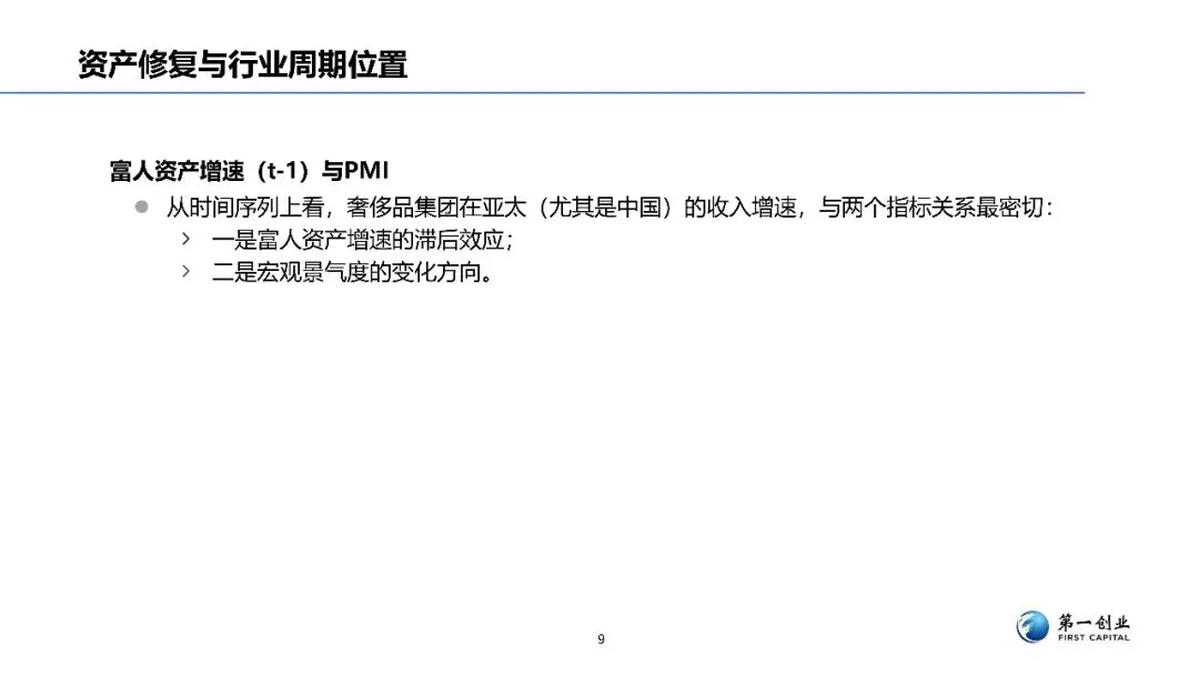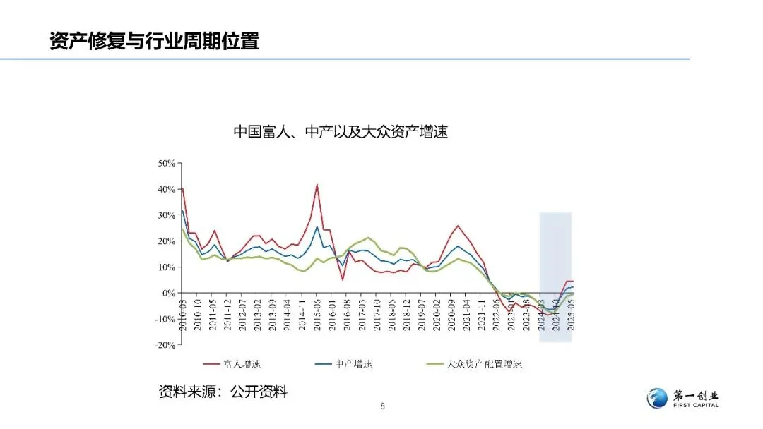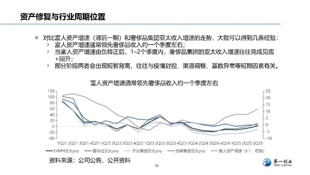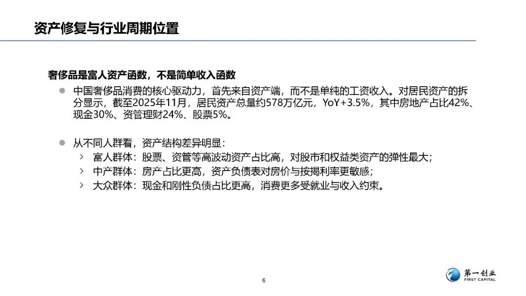 奢侈品本质上是富人资产函数,当前的修复由高净值资产回升和全球库存周期切换共同驱动,高净值人群与重奢品类修复最为明确,中产相关品类修复明显滞后。一方面,高净值资产增速(股权、理财等)领先回暖,带动头部奢侈品牌在华收入与一线核心商圈销售率先企稳;另一方面,大众资产增速偏弱,高端美护、轻奢等更依赖中产心态的品类仍处在震荡调整阶段。