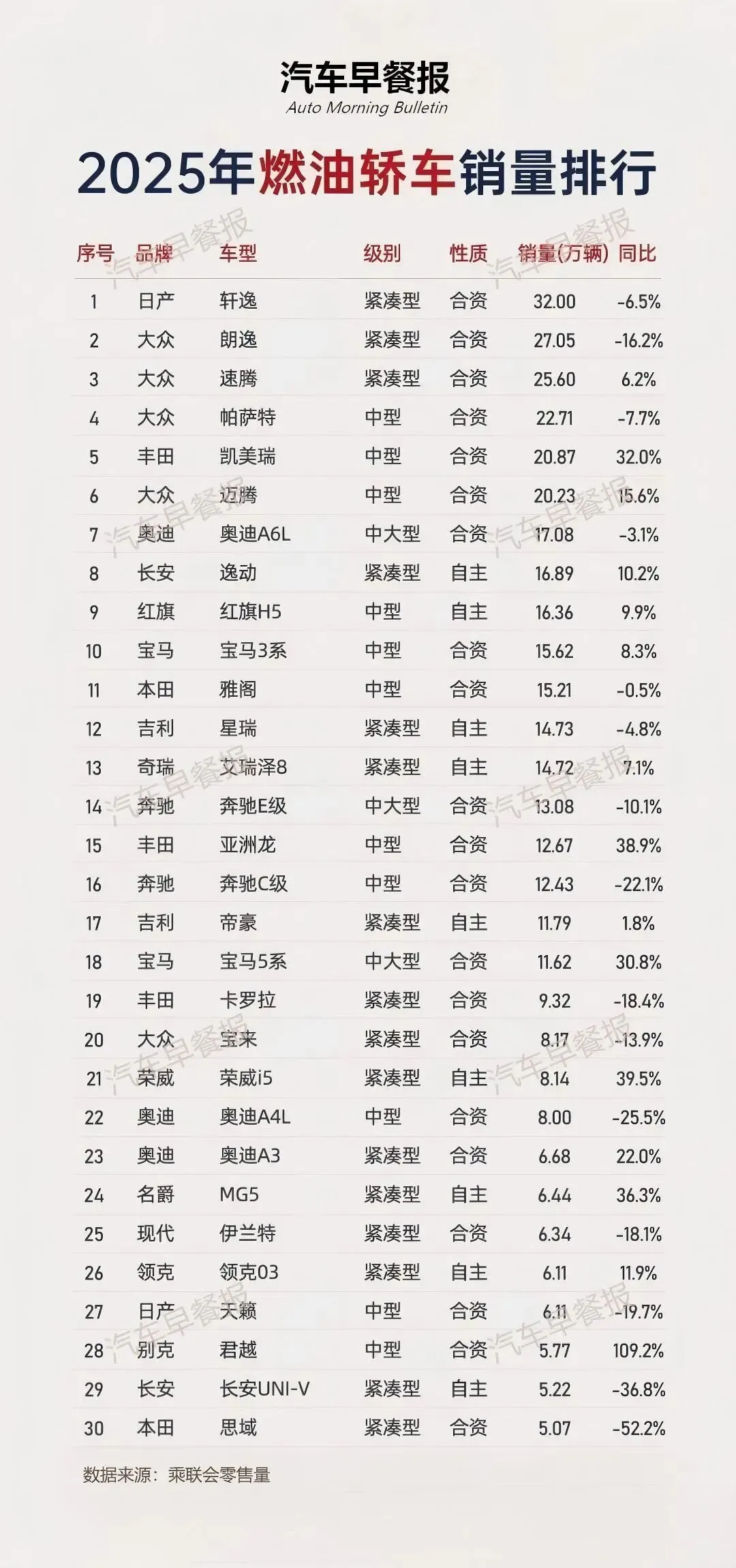 合资品牌依旧主导燃油轿车市场,头部车型虽稳居前列但多数呈下滑态势。日产轩逸以32.0万辆蝉联冠军,同比下降6.5%;大众朗逸、速腾分别以27.05万辆、25.60万辆位列二、三位,朗逸同比降幅达16.2%,紧凑级燃油轿车替代效应显著。