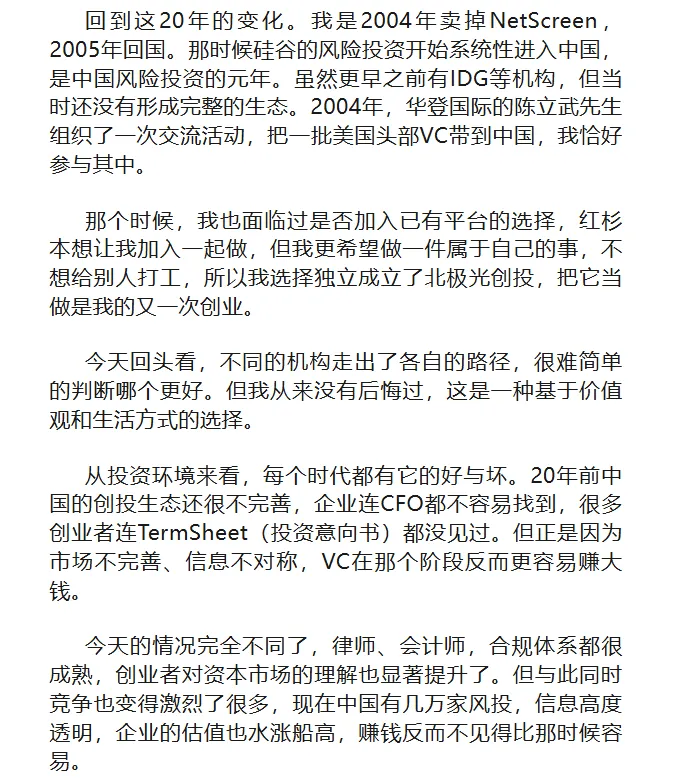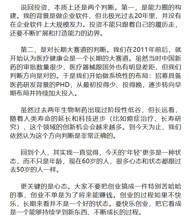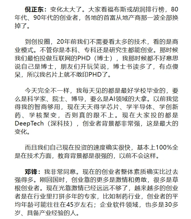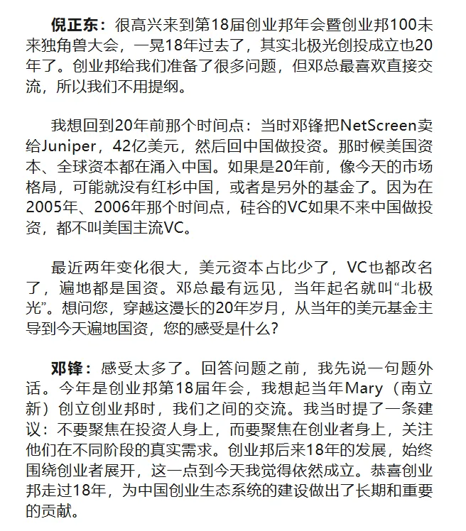 穿越二十年创投周期,中国的一级市场正站在一个新的十字路口。从美元基金主导到国资遍地,从“草根”创业到“科学家”登场,时代的逻辑已悄然重塑。在第18届创业邦年会暨创业邦100未来独角兽大会现场,北极光创投创始管理合伙人邓锋与清科集团创始人、董事长,清科控股(01945.HK)董事长兼CEO倪正东进行了一场穿越周期的深度对话。面对当下的市场情绪,倪正东给出了极具信心的判断,直言2026年将是中国资金“史无钱例”的一年;邓锋则从微观视角——企业成长切入,强调在全球化与硬科技的浪潮下,中国企业需要夯实技术和组织能力,走向全球市场,才能建立长期、可持续的竞争优势。这场对话不仅是对过去的致敬,更是对未来的精准把脉。以下是他们在第18届创业邦年会暨创业邦100未来独角兽大会上的对话实录,由创业邦整理。至于资金机构的变化,无论是国资还是美元资本,这是市场的周期变化。目前国资占主导地位,占比超过八成。但我相信只要中国持续有创新和赚钱的机会,市场化资金和国际资本会逐渐回流,这个趋势已经在二级市场和香港市场出现,未来也会慢慢传导到一级市场。倪正东:是的,我们要适应地缘政治的变化。10年前、15年前是外资VC/PE主导,今天在座的要么是GVC(政府的钱),要么是CVC(企业创投)。回顾过去,互联网和移动互联网时代,我们的GVC其实没赚过一毛钱,阿里巴巴、腾讯、字节跳动跟政府基金关系不大。但是今天,在硬科技时代,像摩尔线程、沐曦,还有做机器人的宇树科技,这些最牛的公司背后赚钱最多的都是中国政府的基金、国资的基金。这是巨大的变化。市场已经连续三年下跌,但2025年已经回暖了。对于在座的创业者,2026年将是中国资金“史无钱例”——历史上钱最多的一年。国家发改委的一千多亿、社保的两千亿,还有更多的资金正在进入市场。如果到2026年还有人说我们处在“资本寒冬”,那你绝对不是这个行业的人。因为钱太多了,融资热度可能会回到2021年。邓锋:正东,我也问你一个问题。除了投资,从你的角度看,中国企业家的画像在过去20年发生了什么变化?你怎么看中国企业家过去20年的变化?倪正东:确实。这里我一直有个好奇的问题。我看了一下北极光历年的投资数据,作为一位IT技术出身的前辈,您投资的项目中超过一半是医疗健康。在这么一个AI时代,您为什么连续好几年重仓医疗?是因为你想帅气、长寿,还是因为什么原因?邓锋:和我自己一点关系都没有,你听我这个嗓子,现在还在感冒。这也是我为什么愿意做科技投资、早期投资的原因,因为每天都可以学习到新东西,每天都在和优秀的人交流,心态自然就会保持年轻。一个企业家要想把企业做得长久,一定要有乐观的心态,同时规律运动、保持节奏、照顾好家人和自己,才能在七八十岁的时候依然精力充沛。倪正东:前几年整个行业都很焦虑,最近大家好像看清很多,而且今年跟前面不一样,2026年是非常有意思的一年,以前投资行业的战斗在春节之后,但是今年不一样,今年1月2日就有公司上市,1月元旦一过就已经投入战斗,大家都在飞行的路上。邓锋昨天从香港回来,我昨天从新加坡回来,他今天开完会马上飞杭州,我马上飞长沙,今年元旦一过,大家都在飞行的路上。这是以前从来没有见过的事。最近投资界状态好很多,大家不熬夜盯美股了(因为去美国上市的少了),打掼蛋也少了,开始忙起来了。因为去美国上市的很少,大家都是每天香港上市,一天好几个公司上市,我们去年3家公司香港上市,一下子关注香港的资本市场。在2025年上半年说香港上市,某个著名VC说谁去香港就打断腿,现在香港最近最火的minimax都买不到,香港市场一下子非常重要。而且香港对中国来说确实非常重要,在香港不叫出国叫做出境,香港是中国走向国际、连接国际资本市场最好的地方。邓锋:我也是审慎乐观的看待香港市场。一方面,整体流动性在改善;另一方面,一个很重要的因素是,国际大型资本进入香港相对更容易,以生物制药的企业为例,很多公司在上市时,引入的基石投资者都是国际上长期活跃的大型机构,无论是18A(医药)还是18C(科技),都能明显感受到资本在回流。邓锋:我想问你一个问题,我们总讲中国的企业家扎堆、同质化,很多都说风口来了追风口,投资人也是这种逻辑,往未来看,底层的投资逻辑有没有发生根本的变化,创业逻辑有没有发生根本的变化,未来十年,什么地方会发生根本变化,企业家该怎么面对这些变化?企业家有时候要意识到,并不一定要扎堆去做大模型、拼算力、比谁融资多。真正有价值的机会,往往存在于那些相对不被关注的“非共识”领域。举个例子,在AI的基础设施层面,中国面临的现实问题和美国并不完全相同,这意味着中间有很多重新设计和改造的机会。比如专门做涡轮电机叶片的公司,你会发现它们估值涨得很快,为什么?因为这跟AI算力的能源相关。这种隐形的机会很多。另外关于上市,我自己也在持续思考。过去我们做投资,更强调企业的内生成长,对政策因素关注相对有限。但未来十年,中国的资本市场可能会持续带有政策性指导,企业家要学会根据国家重点支持的产业方向调整成长路径和策略。至于是在香港、美国还是A股上市,起步时不用太纠结,先发展业务,随着企业成长,再结合政策环境和市场条件,选择更合适的上市或退出路径。倪正东:感谢邓锋