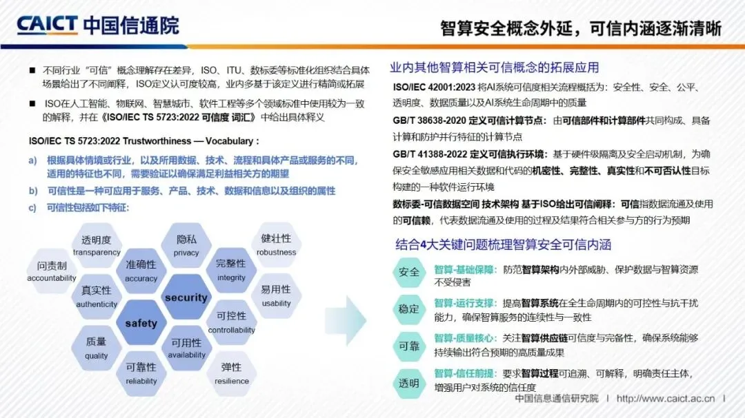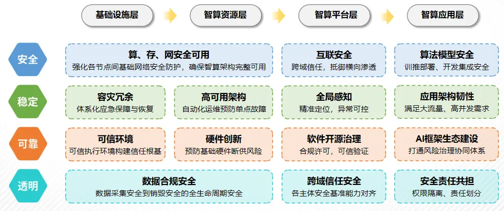 智算安全可信核心内涵主要集中在四个方面:安全,是抵御内外威胁、保障数据和计算资源安全的基本保障;稳定是操作的保障,提高了系统的抗干扰性,保证了服务的连续性;质量的核心是可靠性,确保供应链完整,产品输出达到预期效果;透明是建立信任的前提,要做到流程可追溯,责任明确。这四个内涵与智算系统的各个层次进行深度对应,构成全局保护网络。