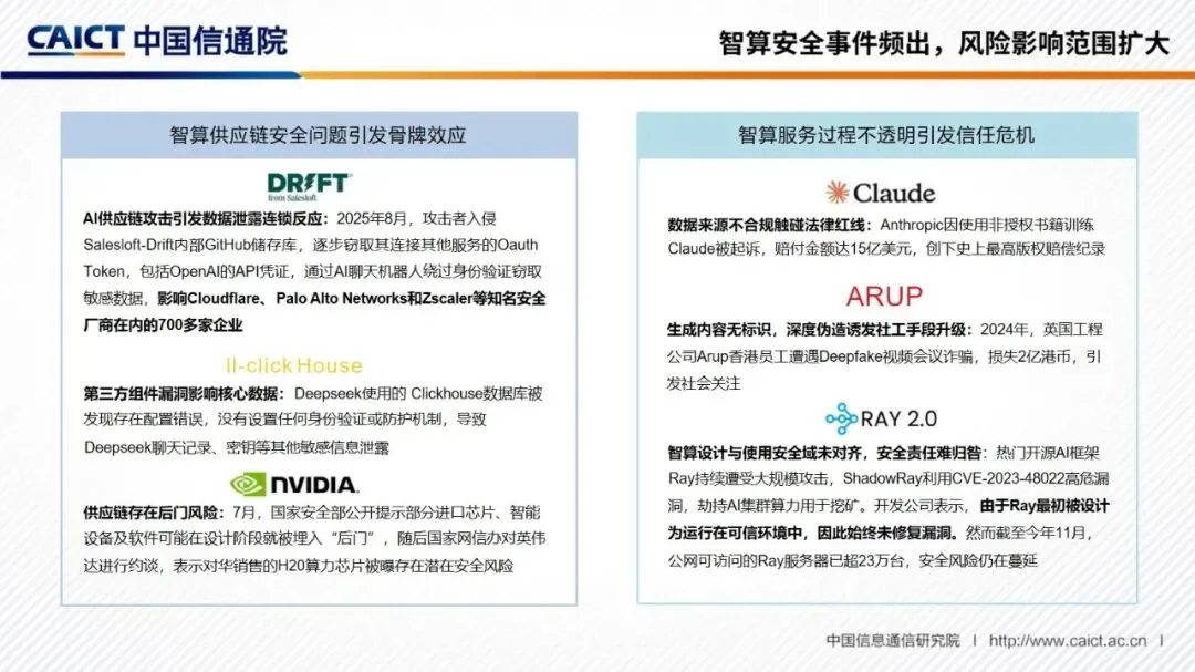 目前,智算安全事故频繁发生,安全风险遍及整个智算系统的产业链。运营方面,Cloudflare由于配置问题导致全球宕机,ChatGPT更是出现了8小时的断网事件,充分暴露了运维弹性的不足;在体系结构层次上,恶意软件“ShadowInit”利用了GPU的安全漏洞对集群进行了入侵,每次入侵耗费了6400个GPU小时的计算资源;供应链层面上,Deepseek公司因第三方元器件的安全漏洞而暴露敏感信息,进口芯片的“后门”问题引起了政府的高度重视;在服务方面,Anthropic支付了15多亿美元的数据源违规赔偿,而深度造假技术已经给企业带来了巨大的损失。这些事件说明智算的安全风险已经渗透到基础架构,资源,平台和应用的全层次。