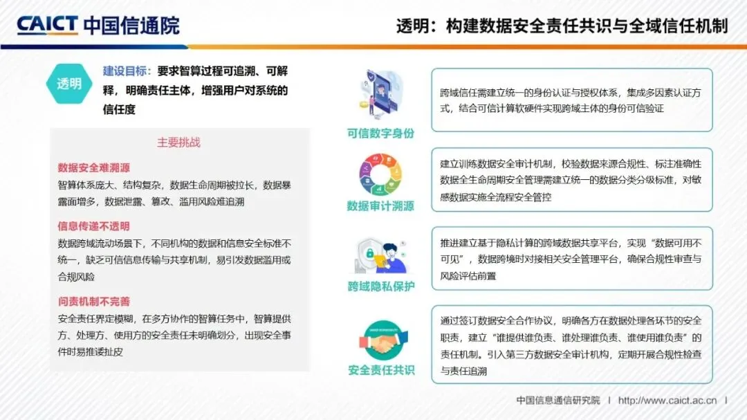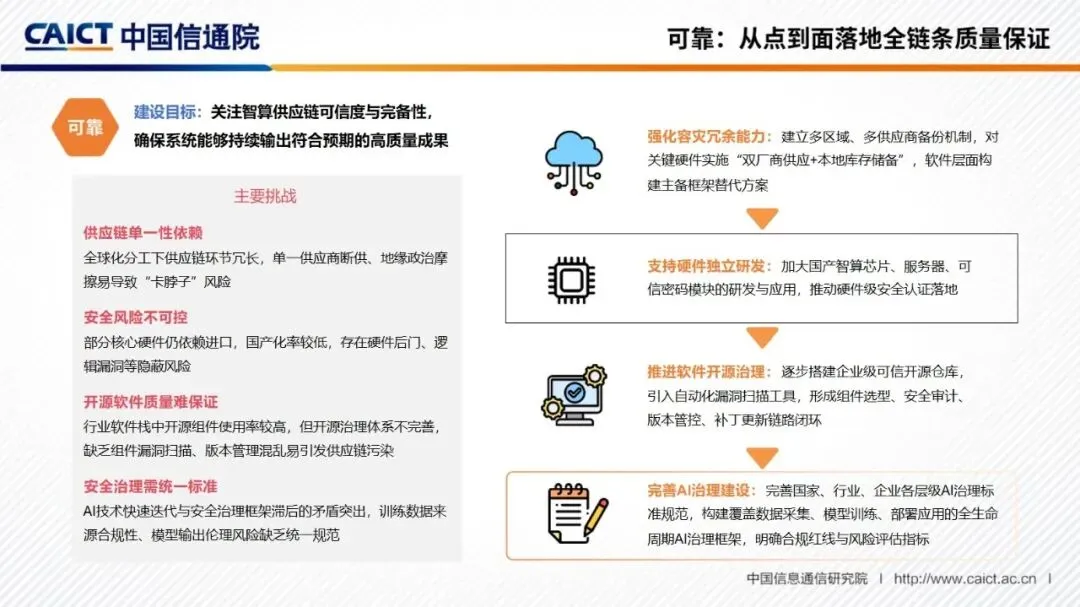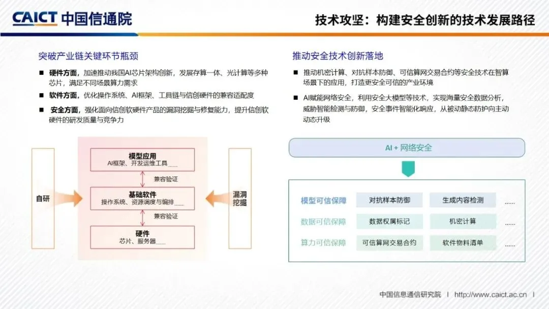 在建设途径上,从下至上构建动态安全体系结构:计算层采用微分片+零信任网的方式实现全局可信;应用层构建整个生命周期的安全保护机制,提高模型的健壮性和界面管理;稳定保证主要依靠高可用体系结构和智能运维技术,利用故障注入训练提高系统的容错性;供应链要可靠,需推动硬件国产化和开源管理,建立两个供应商的供货体系;透明就是要建立健全数据的审计溯源和跨域的信任机制,并对各参与方的安全责任进行明确。